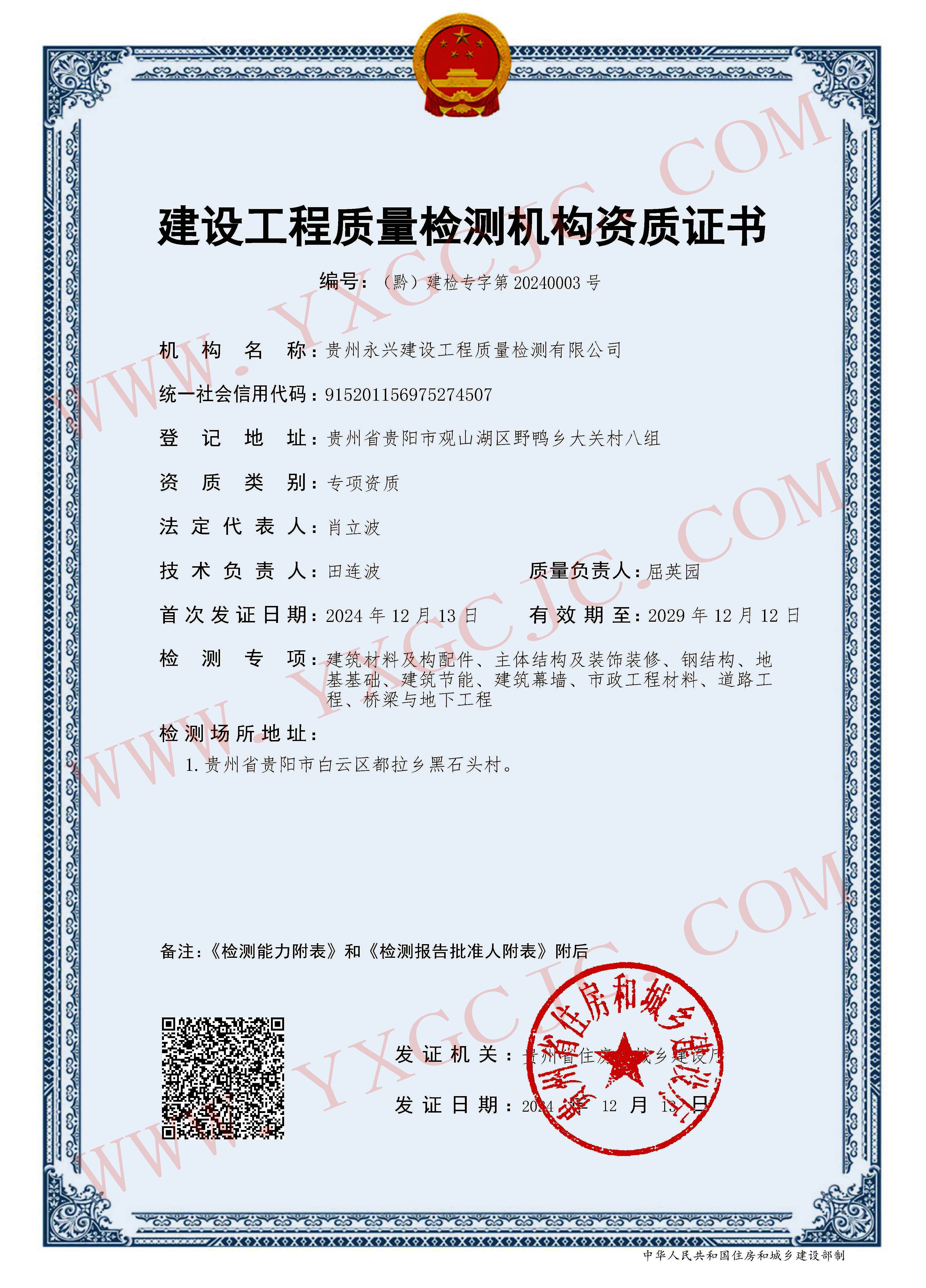 貴州永興建設工程質量檢測有限公司成立于2009年12月21日,主要承接房建、市政、鐵路、公路工程質量檢測業務,并開展新技術、新材料、新工藝的研究開發與推廣應用。公司取得的資質有:建設工程質量檢測(見證取樣、地基基礎、主體結構、鋼結構、門窗幕墻、室內環境)、公路工程試驗檢測、工程勘察、雷電防護裝置檢測。公司通過檢驗檢測機構資質認定批準檢測項目156項、檢測參數1422個,公司還通過了質量管理、環境管理、職業健康安全管理體系認證。 ...